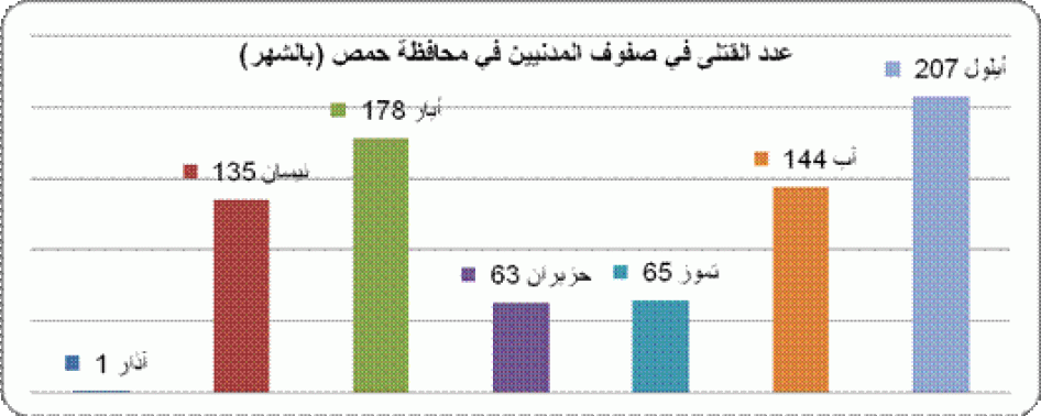 بسبب القيود على المعلومات المتوفرة من سوريا، فإن من المستحيل معرفة العدد الدقيق للقتلى. هناك معلومات متوفرة من نشطاء ومنظمات من داخل سوريا تشير لأن مئات الأشخاص قُتلوا في محافظة حمص منذ بدء التظاهرات هناك أواسط مارس/آذار. وقعت الكثير من عمليات القتل أثناء الهجمات على تجمعات كبيرة من المتظاهرين وعلى الجنازات الشعبية، مثل مقتل عدد من الاشخاص في ساحة الساعة الجديدة في 19 أبريل/نيسان، ومقتل 16 شخصاً أثناء مسيرة جنازة بالقرب من مسجد خالد بن الوليد في حي الخالدية في 19 يوليو/تموز (التفاصيل أدناه). وهناك عمليات قتل أخرى وقعت أثناء عمليات الاعتقال، وهناك حوادث تورطت فيها قوات الأمن والميليشيات إذ أطلقوا النار على السائرين في الشوارع أثناء مرورهم داخل سيارات.