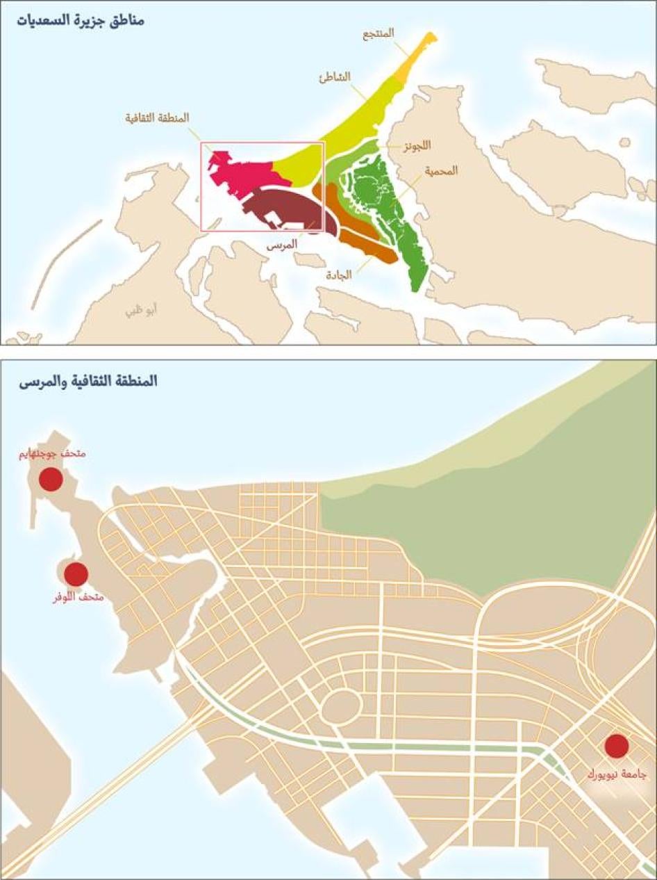 تعكف إمارة أبو ظبي في الإمارات العربية المتحدة على تحويل جزيرة السعديات إلى مقصد سياحي عالمي، بكلفة تتراوح بين 22 إلى 27 مليار دولار. هذه الجزيرة القريبة من مستوى سطح البحر في الخليج العربي سوف تستضيف فرعاً جديداً لجامعة نيويورك، ومتاحف، منها فروع لمتحفي غوغنهايم واللوفر، ومركزاً للفنون التمثيلية، وكل من هذه الأماكن من تصميم مؤسسات هندسية ذات سمعة عالمية، وكذلك ستُشيد في الجزيرة ملاعب للغولف وفنادق ومساكن فخمة. الشريك الأساسي في تطوير الجزيرة هي شركة التطوير والاستثمار السياحي في أبو ظبي، وهي شركة أنشأتها الحكومة وتملكها. وقد قامت مؤسسات ثقافية مثل غوغنهايم واللوفر بتوقيع اتفاقات مع الشركة من أجل إنشاء مراكز لهذه المؤسسات على الجزيرة. في يناير/كانون الثاني 2012 أعلنت شركة التطوير والاستثمار السياحي عن إطار زمني جديد للمتاحف، يعالج فترات التأخير المطولة في الإنشاءات. من المقرر الآن افتتاح اللوفر أبو ظبي في 2015، بينما من المقرر افتتاح غوغنهايم في عام 2017. ويعتبر جهاز الشؤون التنفيذية في أبو ظبي – وهو هيئة حكومية تقدم استشارات إستراتيجية لرئيس جهاز الشؤون التنفيذية لأبو ظبي – هو المسؤول عن تطوير وإنشاء فرع جامعة نيويورك، المقرر افتتاحه في عام 2014.