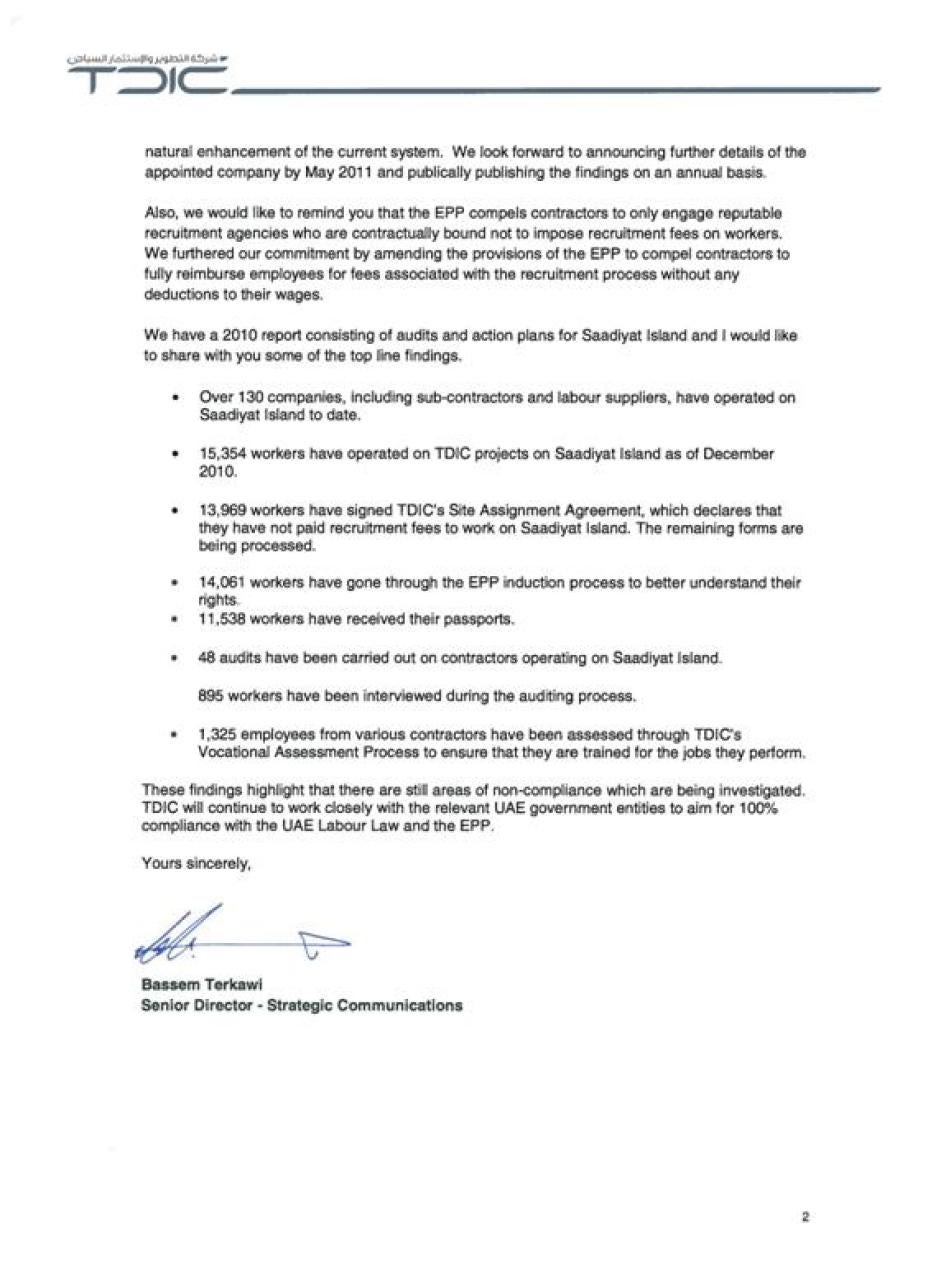 في فبراير/شباط 2011 عرضت هيومن رايتس ووتش أحدث ما توصلت إليه من نتائج في رسالة لم تُنشر (وهي منشورة في ملحق هذا التقرير) أرسلتها إلى الأطراف الأساسية في مشروع تطوير جزيرة السعديات، ومنها شركة التطوير والاستثمار السياحي، وجهاز الشؤون التنفيذية لأبو ظبي، وجامعة نيويورك وغوغنهايم ووكالة المتاحف الفرنسية، وعقدت اجتماعات مع جامعة نيويورك وغوغنهايم واللوفر، وألقت الضوء على استمرار الانتهاكات في الجزيرة، وشددت مرة أخرى على الحاجة للمراقبة المستقلة والتعويض والإنصاف الحقيقيين للعمال الذين يسيئ إليهم أصحاب عملهم ومكاتب الاستقدام. بينما ردت جميع المؤسسات على النتائج الواردة في خطابنا، فإن ردودهم تباينت بشدة من حيث المعلومات التي وفروها، واستعدادهم للإقرار بانتهاكات حقوق الإنسان والتصدي لها، تلك التي تسببت فيها ممارسات العمل المتبعة بشكل عام في الإمارات. ولقد أكدت جميع المؤسسات على الأقل على التزام عام بحماية حقوق العمال في مواقع الإنشاءات الخاصة بكل منهم.[4]