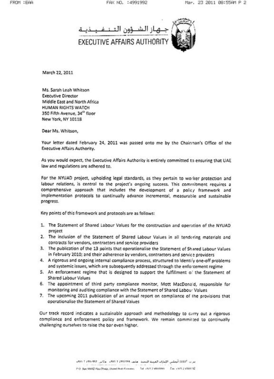 ورغم استمرار جامعة نيويورك في الصمت بشأن هذه الوعود الأولى، فقد أقرت الجامعة بالحاجة لضمان تلقي العمال للمعلومات الكاملة عن عملهم قبل توقيع العقود. رد الجامعة على هيومن رايتس ووتش ورد فيه أن: "لابد أن تتوفر العقود دائماً بالإنجليزية والعربية (كما ورد في نص القانون الإماراتي)، وأن بالإضافة إلى ذلك، لابد من توفر مترجمين للمعاونة قبل توقيع العقد. نحن نتواصل مع المقاولين لضمان حدوث هذا من الآن فصاعدا". [25]