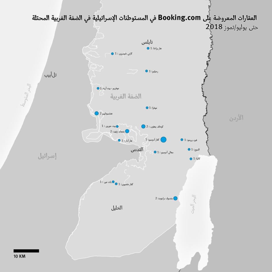 تعرض كلّ من Airbnb وBooking.com أيضا عقارات يملكها فلسطينيون في بلدات وقرى فلسطينية في الضفة الغربية. لا يوجد ما يمنع هؤلاء من القيام بذلك، تماما كما لا يوجد ما يمنعهم عرض عقارات في بلدات وقرى داخل إسرائيل.[78] تُثار هذه المشكلة فقط عندما تعرض Airbnb وBooking.com عقارات داخل مستوطنات غير قانونية في الأراضي الفلسطينية المحتلة يُمنع حاملو بطاقات الهوية الفلسطينية من دخولها.