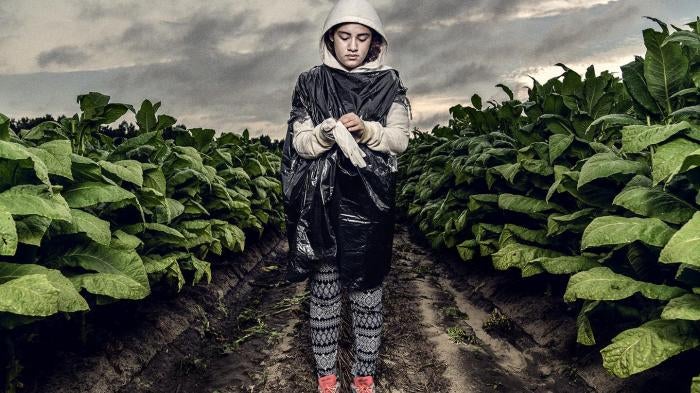 Una joven de 16 años en una plantación de tabaco en Carolina del Norte se pone sus guantes de trabajo. “Cuando estoy en las plantaciones no siento que nada sea diferente de cuando tenía 12 años”, dijo. “[Todavía] tengo dolores de cabeza (…) y sufro del estómago. También siento náuseas… Siento como si el estómago me diera vueltas. Como si estuviera a punto de vomitar”.
