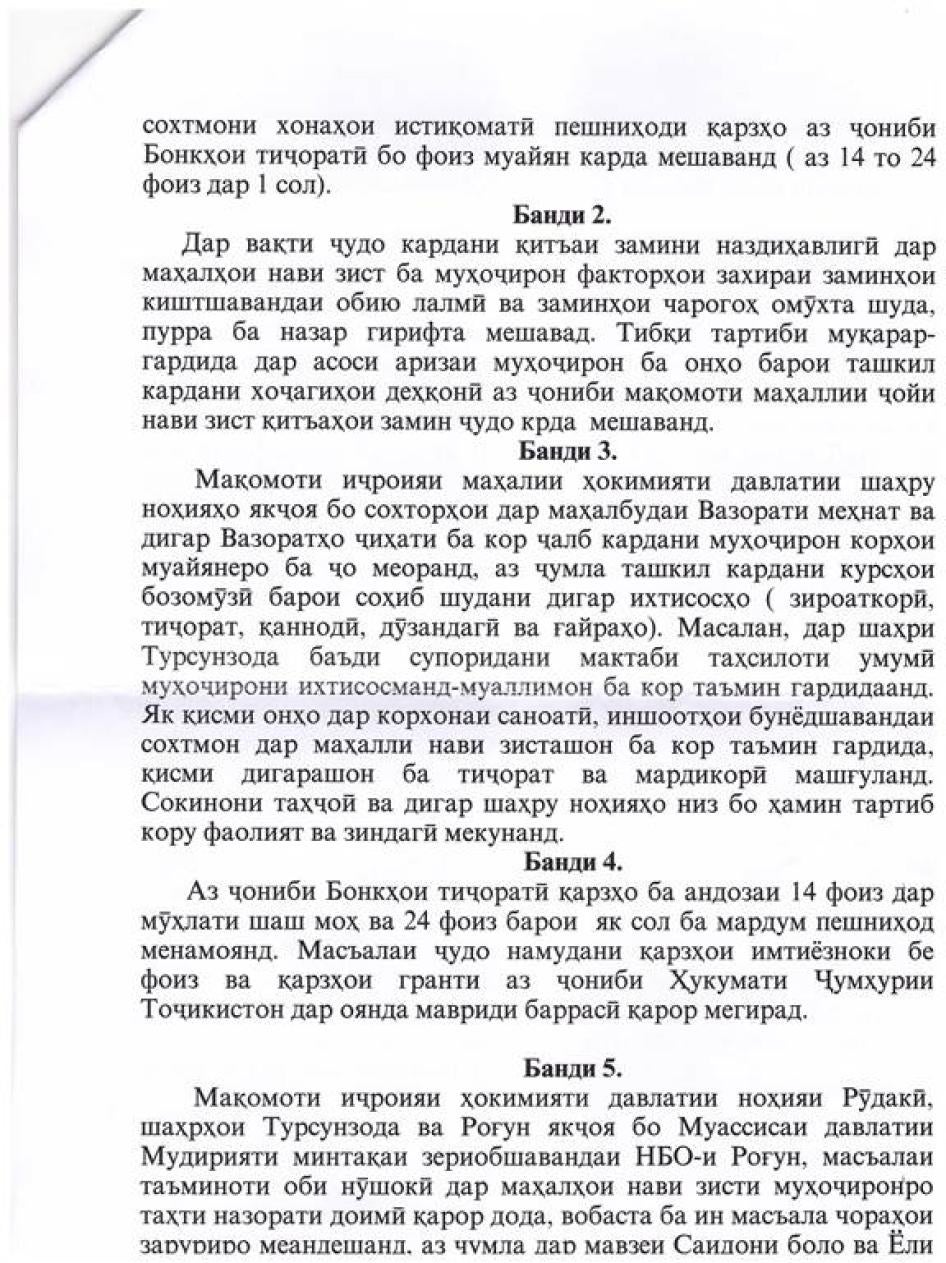 - Маблағгузорӣ кардани ҷанбаи кӯчонидани Лоиҳаи сохтмони НБО Роғун, агар он кафолат диҳад, ки стандартҳои ҳуқуқи башар риоят мешаванд.
