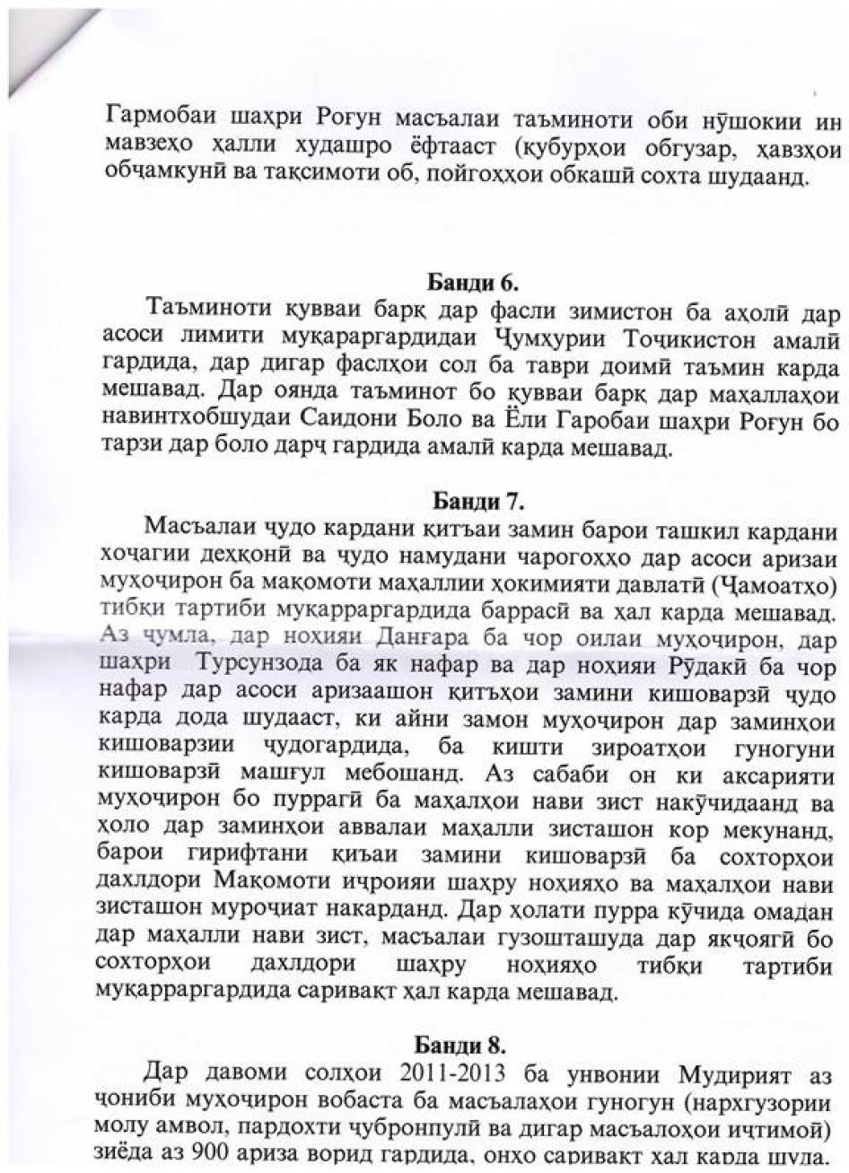 [250] Мактуб аз Самӣ Шариф - директори Муассисаи давлатии Мудирияти минтақаи зериобшавандаи НБО "Роғун", 11 апрели соли 2014, параграфи 8.