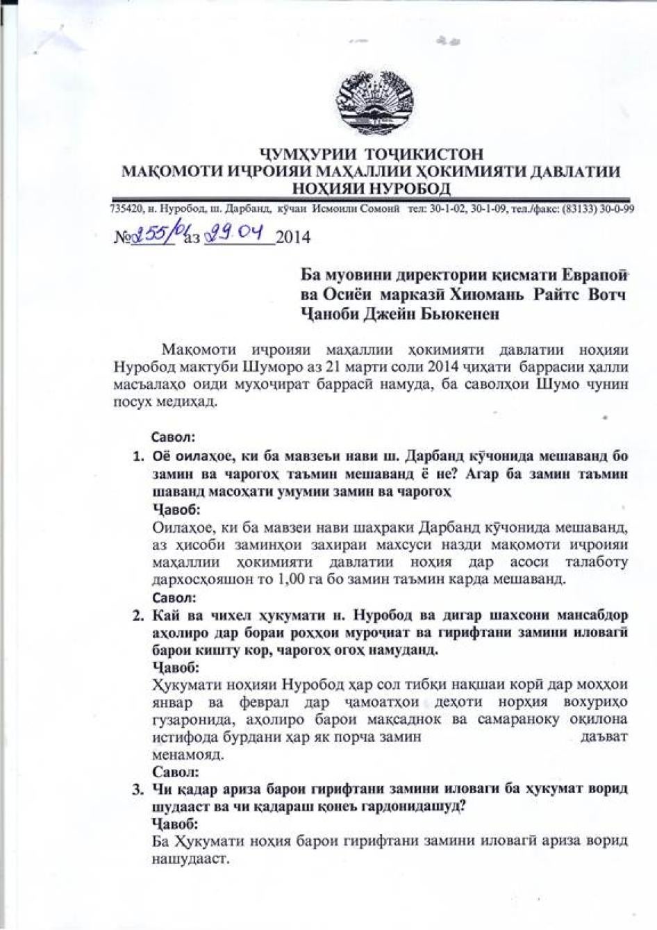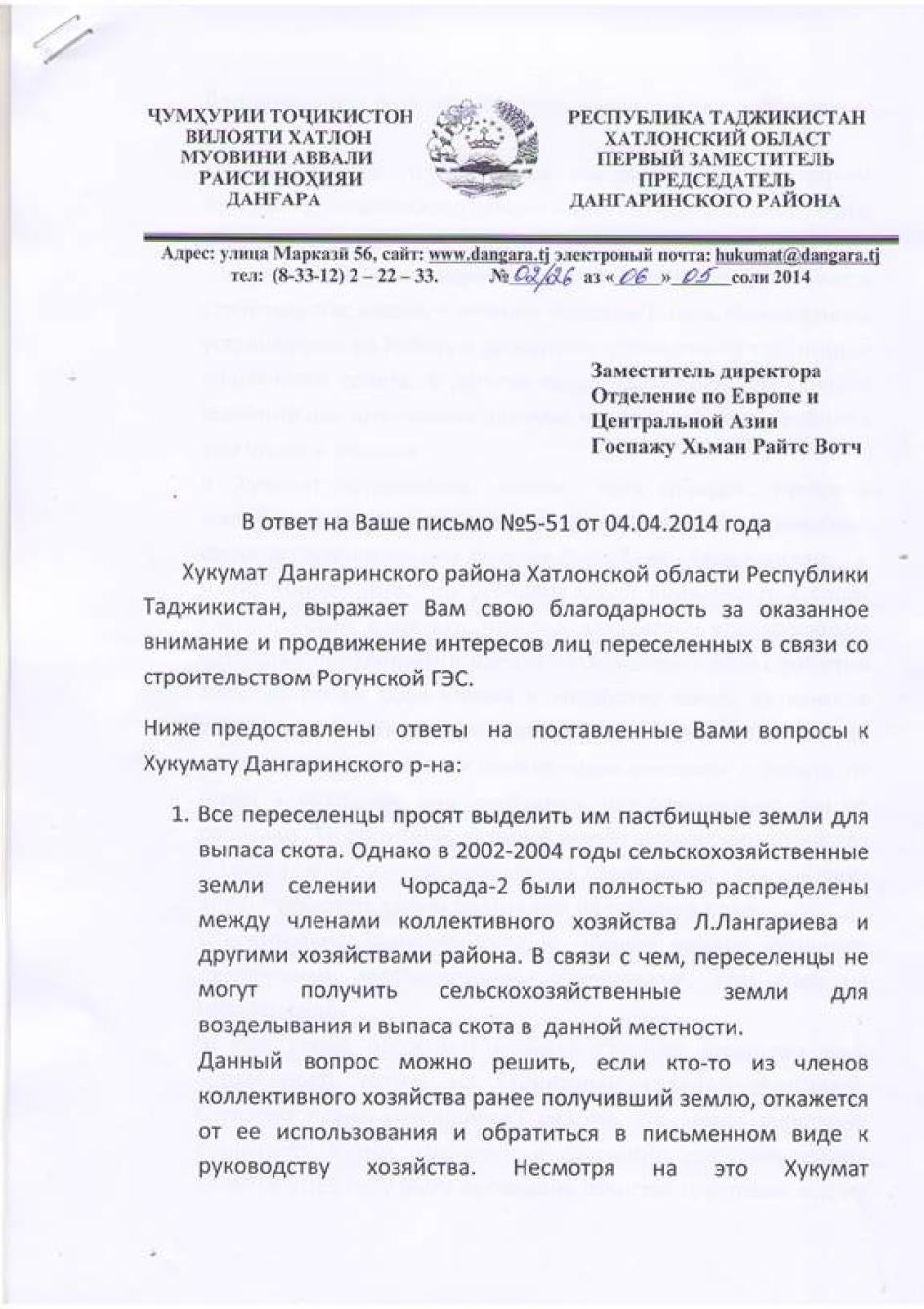 [253] Мактуб аз Марша Олив, менеҷери кишварии идораи Бонки ҷаҳонӣ дар Тоҷикистон ба Созмони Дидбони ҳуқуқи башар, 30 апрели соли 2014.