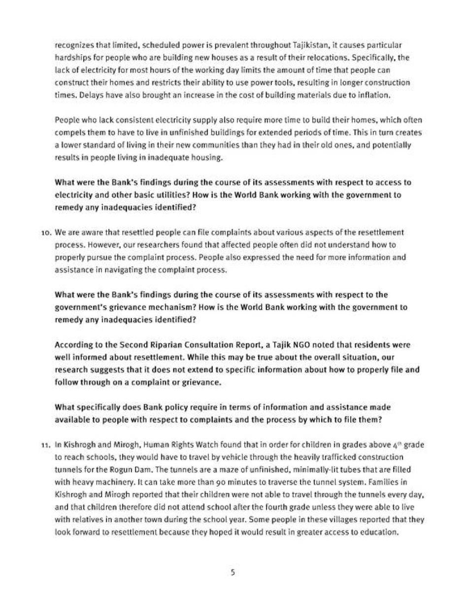 Дар гузориши мазкур ҳолатҳои вайронкунии ҳуқуқи башар (ҳуқуқи инсон) вобаста ба раванди кӯчонидан бар асоси далелу санадҳо пешниҳод мешаванд ва тавсияҳои махсус ҳам барои бартараф кардани қонунвайронкуниҳо дар гузашта ва ҳам пешгирии вайронкунии ҳуқуқи башар дар оянда барои даҳҳо ҳазор нафар, ки бояд кӯчонида шаванд, пешниҳод мешаванд. Созмони "Дидбони ҳуқуқи башар" (Ҳюмен райтс вотч) бар асоси мусоҳибаҳои анҷомшуда бо одамоне, ки дар марҳилаҳои мухталифи раванди кӯчонидан қарор доранд, ошкор намуд, ки стандартҳои зиндагӣ барои бисёре аз оилаҳои кӯчонидашуда ба таври ҷиддӣ бад шудааст ва як қатор монеаҳое вуҷуд доранд, ки ба онҳо имкон намедиҳанд ҳамон стандарти зиндагиро барқарор намоянд, ки қабл аз кӯчонидан доштанд. Аз даст додани замин барои кишту кор ва чаронидани чорво, набудани шуғлу кор, дастрасии заиф ба хизматрасониҳои асосӣ дар ҷомеаҳои кӯчонидашуда душвориҳои зиёдеро барои оилаҳои кӯчонидашуда эҷод кардаанд ва истифода ва бархурдории ҳуқуқҳои бунёдии онҳо ба таври ҷиддӣ коҳиш ёфтааст.