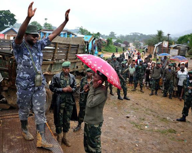 Le chef de la milice Maï Maï Sheka, Ntabo Ntaberi Sheka, fait campagne pour un siège au parlement à l'approche des élections nationales de novembre 2011, bien qu'étant l'objet d'un mandat d'arrêt de la justice congolaise pour crimes contre l'humanité, notamment pour des violences sexuelles. Walikale, Nord-Kivu, 24 novembre 2011.