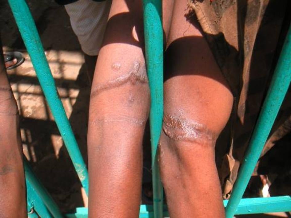 Les personnes qui ont subi cette technique d'interrogatoire sont aisément reconnaissables car elles présentent de larges cicatrices circulaires autour des bras, juste au-dessus du coude et sous l'épaule, provoquées par les liens utilisés lorsqu'elles étaient suspendues. Lors de sa visite à la plus grande prison de Guinée, la Maison Centrale, Human Rights Watch a identifié au moins soixante-dix personnes présentant ce type de cicatrices et elle en a interrogé vingt, dont trois enfants. Un membre d'une organisation locale de défense des prisonniers a raconté avoir vu un prisonnier dont les blessures infligées par la suspension étaient si profondes qu'elles laissaient entrevoir ses os.[14] Plusieurs victimes interrogées par Human Rights Watch ont confié que leurs mains n'avaient pas encore retrouvé toutes leurs sensations, même des années après avoir été suspendues. Selon un défenseur local des droits de l'homme, ces techniques remontent à la période Sékou Touré.[15]
