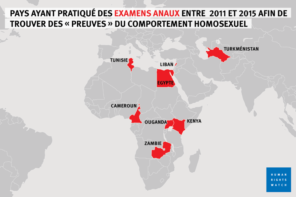 L’Égypte n’est pas un exemple isolé. Human Rights Watch a interviewé des hommes, ainsi que des femmes transgenres venant de huit pays qui ont dit qu’ils avaient subi des examens anaux forcés entre 2011 et 2016. Ces huit pays sont le Cameroun, l’Égypte, le Kenya, le Liban, la Tunisie, le Turkménistan, l’Ouganda et la Zambie.