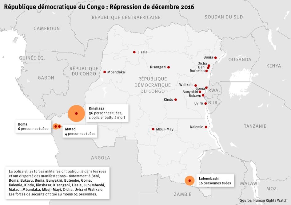 Les forces de sécurité en République démocratique du Congo ont tué au moins 62 personnes et en ont arrêté des centaines d’autres pendant les manifestations à travers le pays entre le 19 et le 22 décembre 2016, après que le président Joseph Kabila ait refusé de quitter ses fonctions à la fin de la limite des deux mandats permis par la Constitution.
