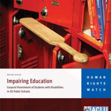 "Impairing Education" is based on more than 200 interviews conducted by the ACLU and Human Rights Watch between December 2007 and June 2009 with experts and individuals directly affected by corporal punishment, including parents, students, teachers, administrators, and special education professionals. It calls for a complete prohibition on the use of corporal punishment against all students in US public schools and offers recommendations to Congress, the Department of Education, and local governments for implementing a moratorium on corporal punishment against students with disabilities until a full prohibition is achieved.