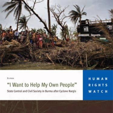 The 102-page report, "‘I Want to Help My Own People': State Control and Civil Society in Burma after Cyclone Nargis," based on 135 interviews with cyclone survivors, aid workers, and other eyewitnesses, details the Burmese military government's response to Nargis and its implications for human rights and development in Burma today. The report describes the government's attempts to block assistance in the desperate three weeks after the cyclone, which struck Burma's Irrawaddy Delta on May 2, 2008, and the concerted response from increasingly assertive Burmese civil society groups to overcome government restrictions to providing assistance. The report details continuing violations of rights to free expression, association, and movement against Burmese aid workers and their organizations by the ruling State Peace and Development Council (SPDC).