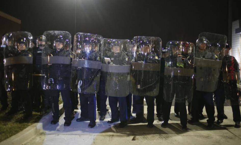 Missouri State Troopers in riot gear stand in formation outside the Ferguson Police Department in Ferguson, Missouri, November 24, 2014. © 2014 Reuters