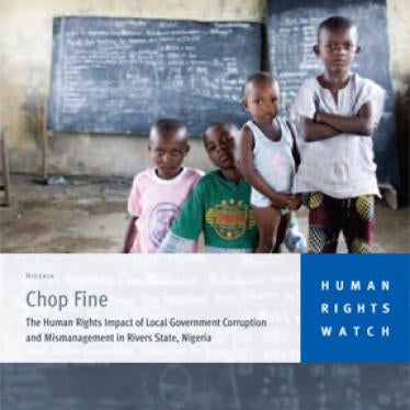 O relatório de 107 páginas, “'Chop Fine': The Human Rights Impact of Local Government Corruption and Mismanagement in Rivers State, Nigeria” (Caixa dois: O impacto da corrupção e má gestão governamental local sobre direitos humanos no estado de Rivers, na Nigéria), detalha o mau uso de fundos públicos por oficiais locais no centro geográfico da crescente indústria do petróleo da Nigéria e os efeitos nocivos para a educação primária e serviços básicos de saúde. O relatório é baseado em dezenas de entrevistas feitas no estado de Rivers com oficiais do governo e de agências doadoras, servidores públicos, trabalhadores da área de saúde básica, professores, grupos da sociedade civil e residentes locais. A Human Rights Watch também analisou os orçamentos dos governos estadual e local.
