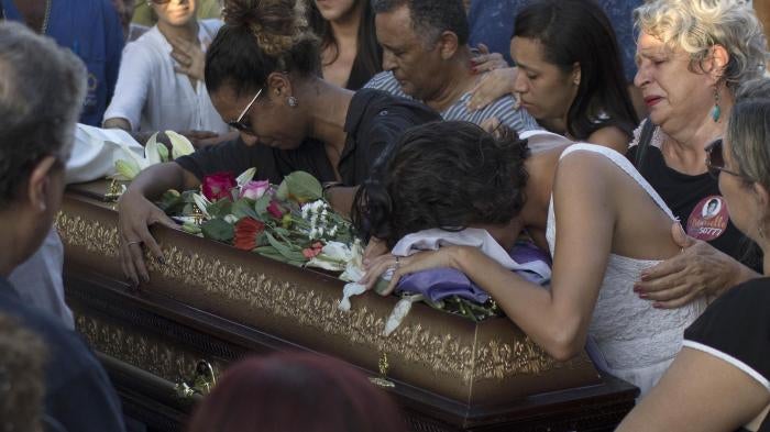 Parentes choram durante funeral da vereadora Marielle Franco, assassinada na noite anterior por dois agressores não identificados no Rio de Janeiro, na quinta-feira, 15 de março de 2018. A polícia disse que a vereadora de 38 anos, conhecida por seu trabalho social nas favelas, foi morta por atiradores que sabiam exatamente onde ela estava sentada no carro, cujas janelas tinham insulfilme.