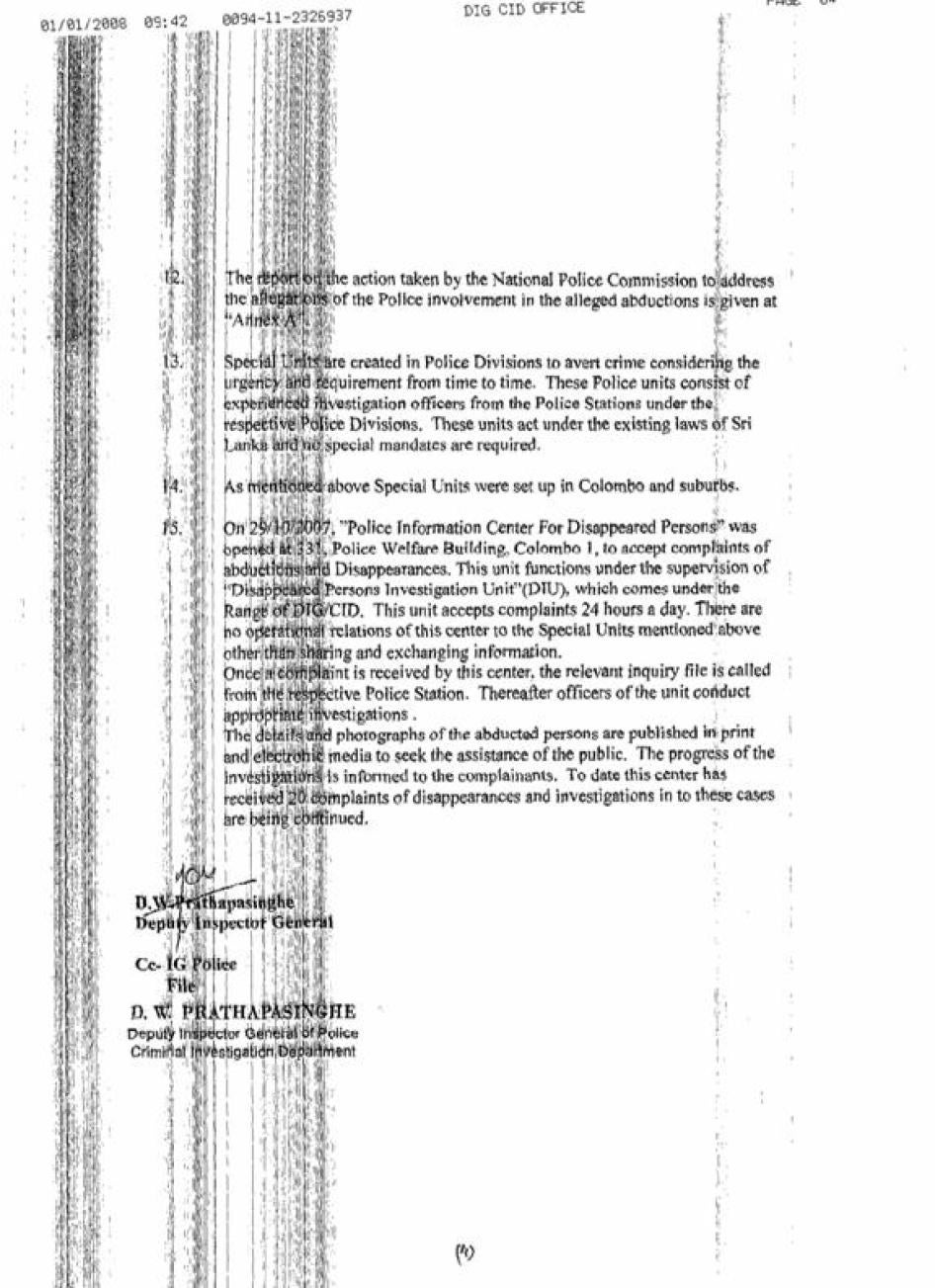 [374] "Special Police Unit to Probe Incidents of Killing," Office of the President media release, September 15, 2006, http://www.slembassyusa.org/archives/main_index_pages/2006/sl_govt_takes_18sep06/pr_presi_secre_15sep06.pdf (accessed October 20, 2007).