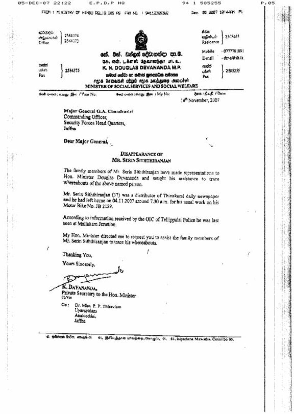 Human Rights Watch has raised its concerns in various meetings with the president of Sri Lanka, the foreign minister, and the minister for disaster management and human rights, among other Sri Lankan officials. Human Rights Watch sent inquiries to various Sri Lankan authorities-the Ministry for Disaster Management and Human Rights, the Inspectorate General of the Police, the Defense Ministry, the Human Rights Commission, and the Presidential Commission on Abductions, Disappearances, and Killings-requesting information related to the issues raised in this report. Human Rights Watch also sent an inquiry to Eelam People's Democratic Party (EPDP).