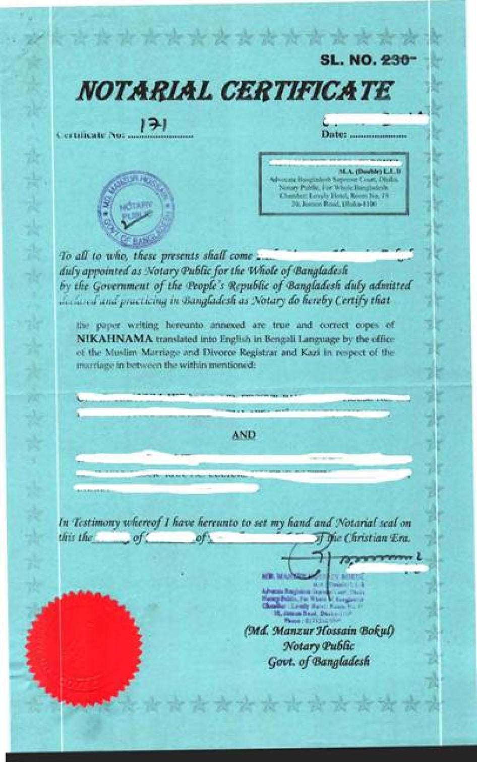 A marriage contract in Muslim law. The Bangladesh government has a standard format for such contracts. |