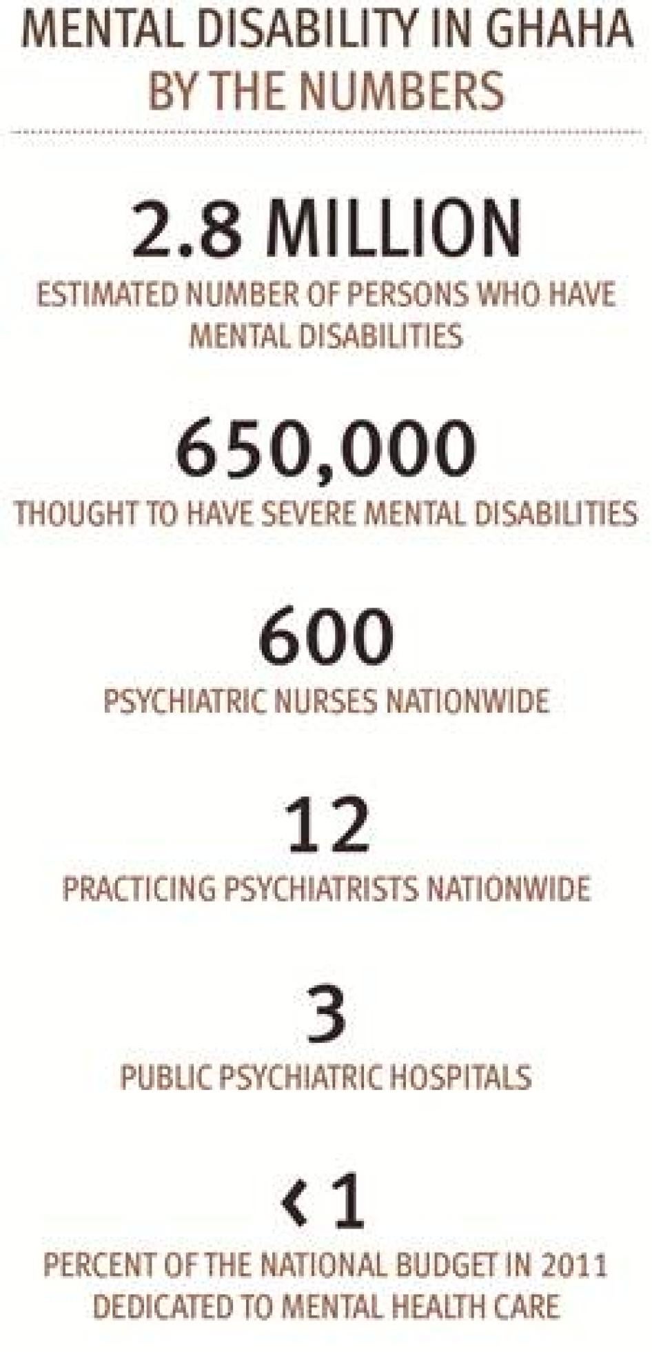 The World Health Organization (WHO) has estimated that there are 2.8 million persons with mental disabilities in Ghana, 650,000 of whom have severe mental disabilities.[4]