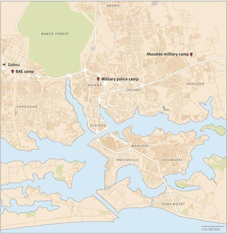 Based on a three week research mission to Côte d’Ivoire in late August and early September 2012, this report focuses primarily on the crackdown by security forces in the Abidjan neighborhood of Yopougon and in the town of Dabou, some 40 kilometers to the west of Abidjan. The majority of the abuses documented occurred at three military camps: the military police base in the Abidjan neighborhood of Adjamé; the former anti-riot brigade (known as the BAE, for its French acronym) base, now controlled by the military, in Yopougon neighborhood; and a military camp in Dabou.