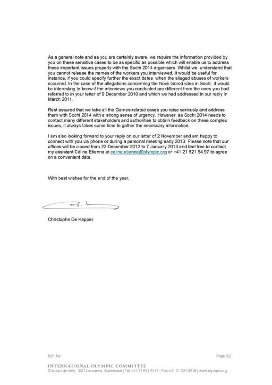 [206] Letter from Christophe De Kepper, general director, International Olympic Committee, to Human Rights Watch, December 9, 2012.