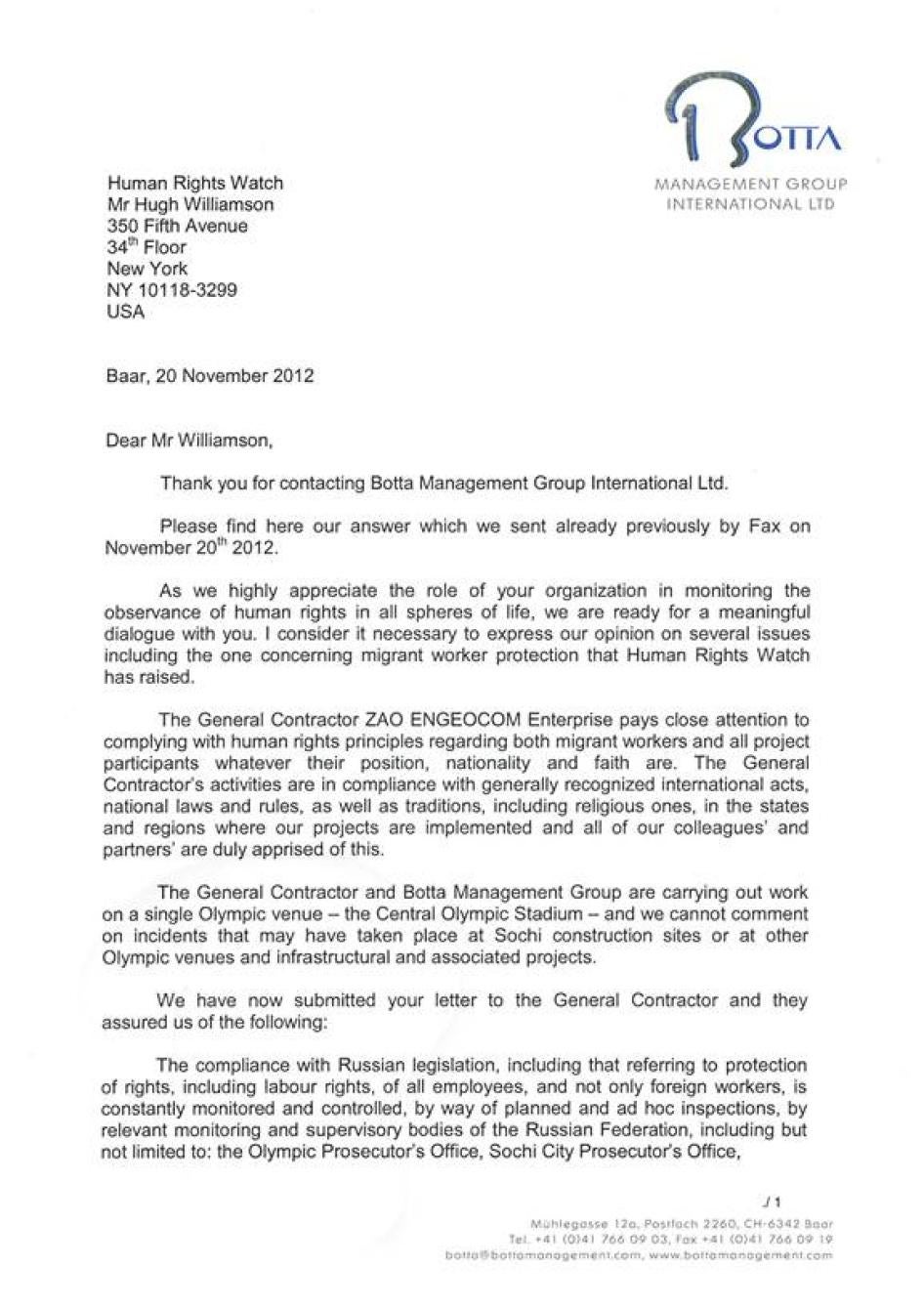 Human Rights Watch did not receive written responses from the six other companies contacted regarding concerns raised in this report. None of the companies responsible for construction on the Main Olympic Village responded, including Austrian construction company STRABAG SE, the general contractor for the site. STRABAG, SE is one of Europe’s leading construction companies and one of the most prominent foreign companies in the Russian construction market.