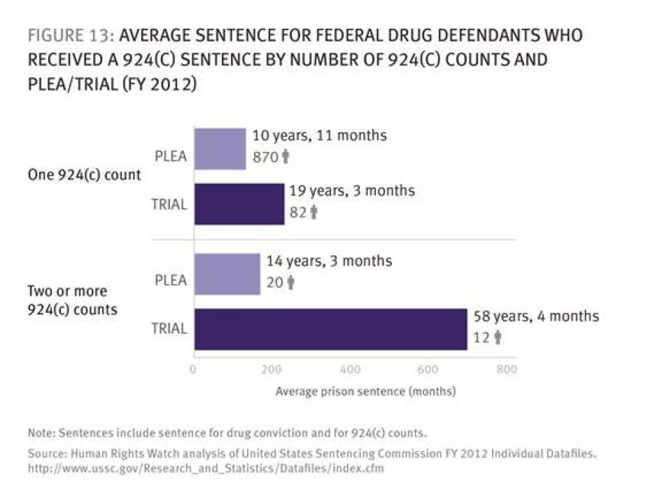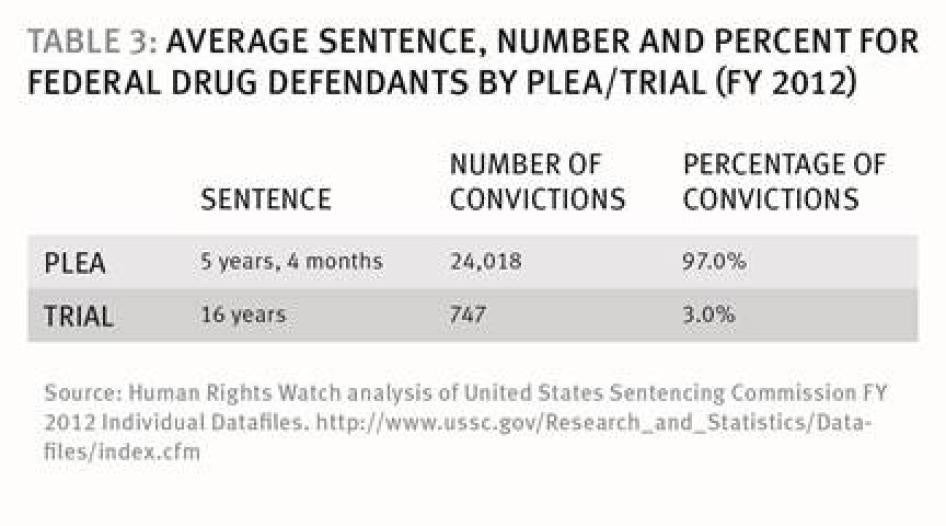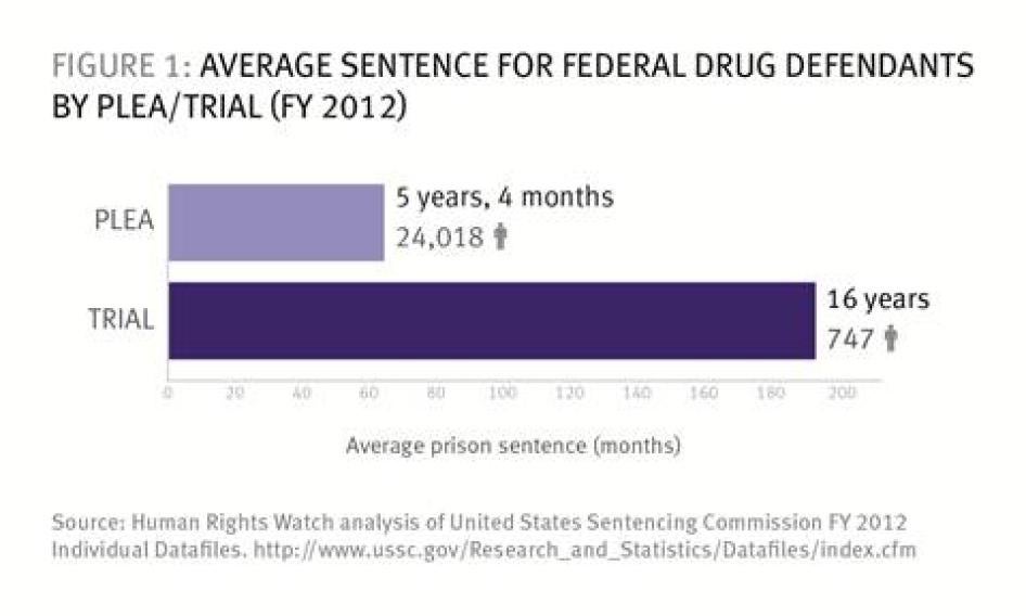 Plea bargaining means higher sentences for defendants who go to trial. In 2012, the average sentence of federal drug offenders convicted after trial was three times higher (16 years) than that received after a guilty plea (5 years and 4 months).