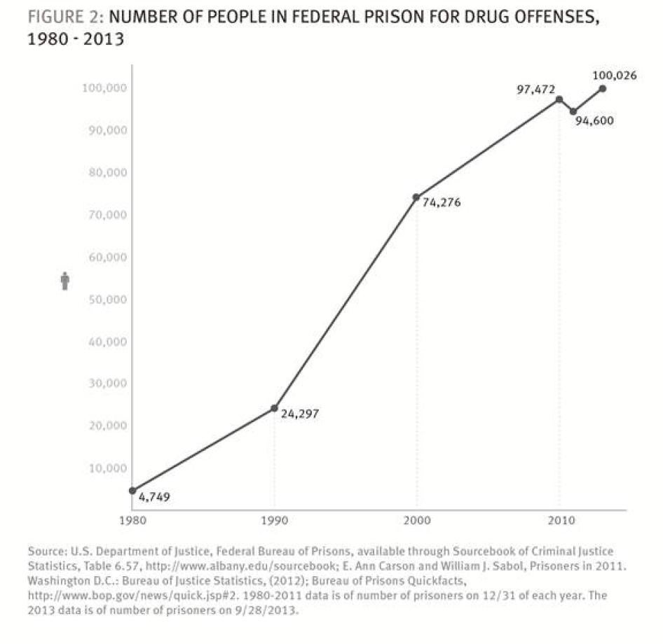 Between 1980 and 2013, the number of incarcerated federal drug defendants soared from 4,749 to 100,026—an astonishing 2,006 percent. As of September 28, 2013, half—50.1 percent—of all federal prisoners were serving time for drug offenses.[15] In fiscal year 2012 alone, 26,560 men and women were convicted of federal drug crimes.[16]