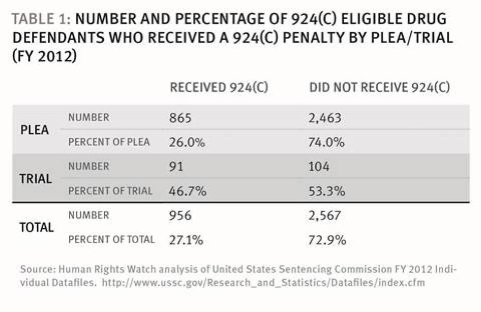 [333] Out of a total of 984 defendants convicted of one or more §924(c) counts, 288 received a §5k1.1 sentence departure for substantial assistance, all but two of whom pled guilty. Human Rights Watch analysis of United States Sentencing Commission Fiscal Year 2012 Individual Data Files, http://www.ussc.gov/Research_and_Statistics/Datafiles/index.cfm.