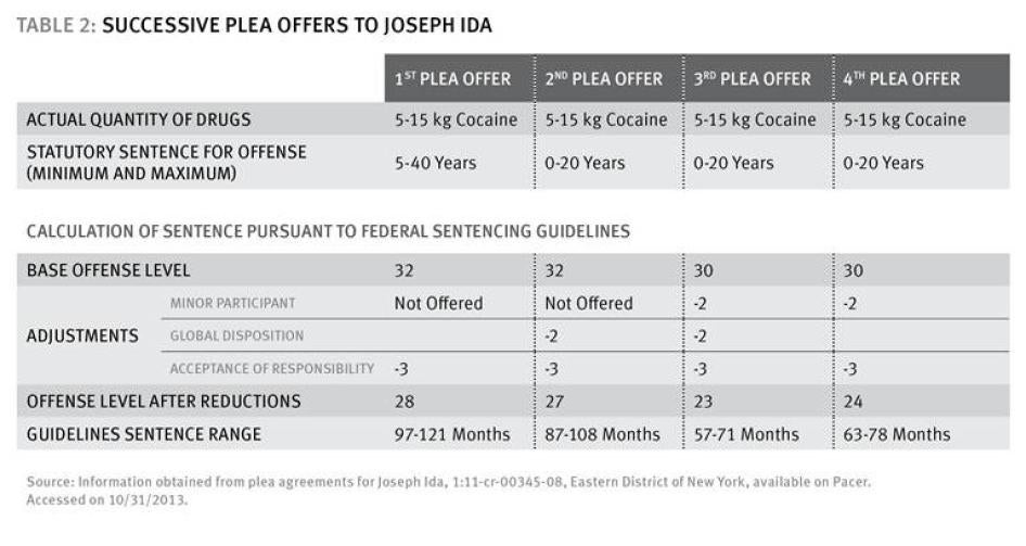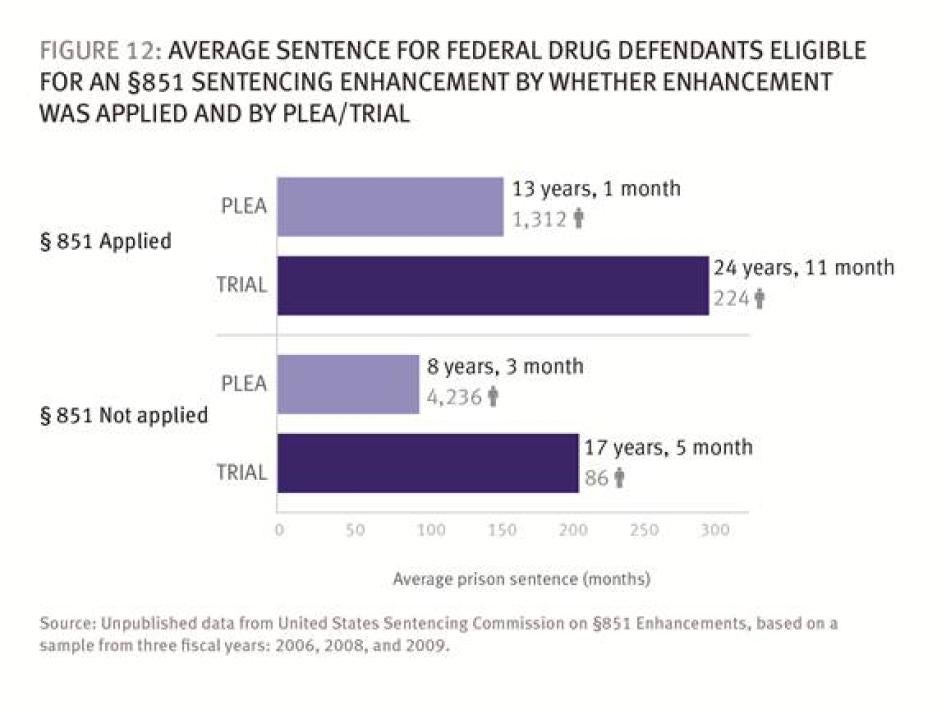 - Defendants convicted of drug offenses with mandatory minimum sentences who went to trial received sentences on average 11 years longer than those who pled guilty (215 versus 82.5 months).