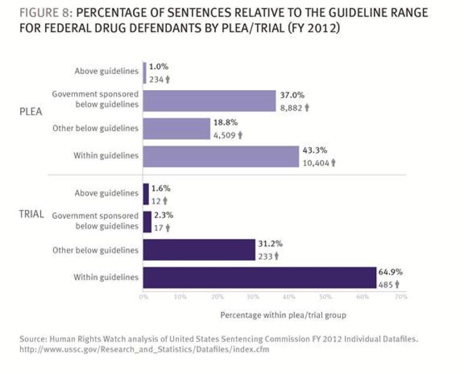Using sentencing data from individual cases collected nationwide by the United States Sentencing Commission (the Sentencing Commission), most of it from 2012, Human Rights Watch has developed statistics that shed light on the size of the trial penalty. Each case contains a unique mix of factors that results in the final sentence, but our findings nonetheless provide deeply troubling evidence of the price defendants pay if they refuse to plead.