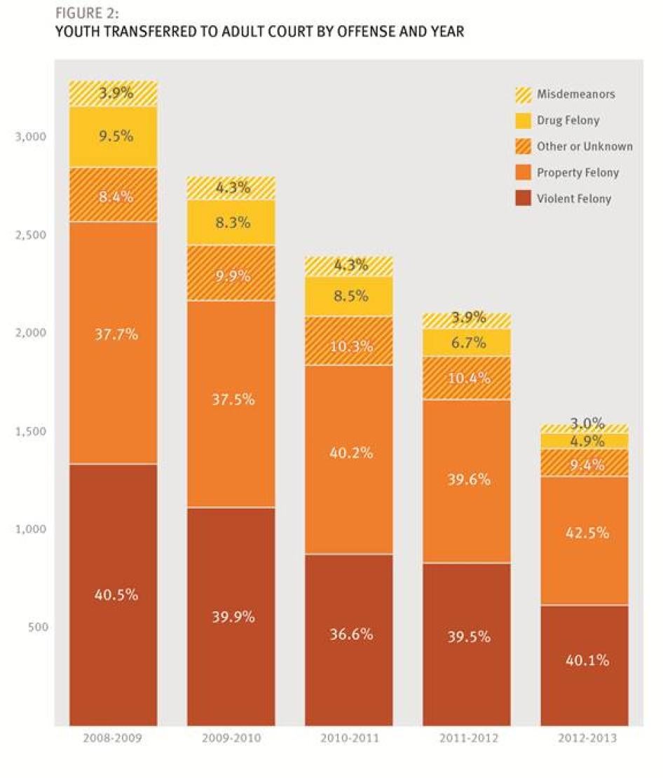 Many people know that children in Florida can be tried as adults for serious crimes of violence. Lionel Tate made headlines in 2001 when, at age 12, he was convicted and sentenced to life in prison without parole for the killing of a 6-year-old neighbor. Far less widely appreciated is that Tate represents a tiny minority: far more common are cases—like Oliver’s and Matthew’s—in which Florida children are tried in adult court for nonviolent crimes. Of the 1,535 children tried in adult court in Florida in 2012-13, 865 had been accused of committing nonviolent felonies; another 54 were sent to adult court to face misdemeanor or other non-felony charges.