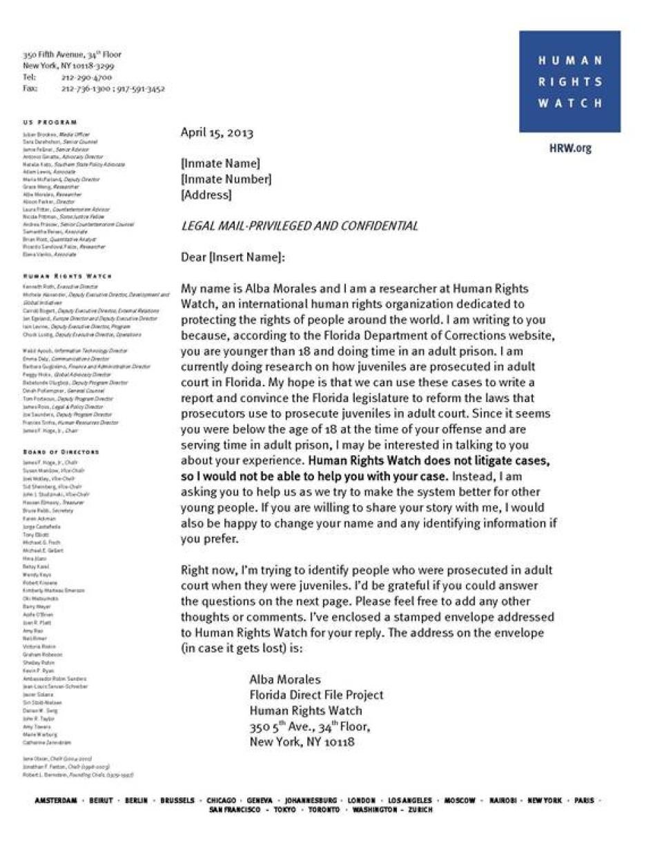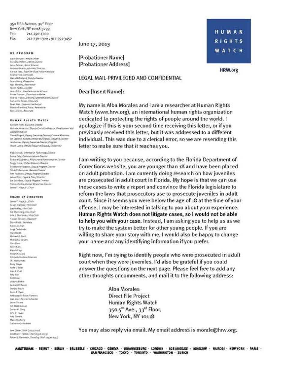 Human Rights Watch identified individuals prosecuted in adult court by searching the Florida Department of Corrections offender database, available at http://www.dc.state.fl.us/pub/obis_request.html. Human Rights Watch sent a letter and survey, the templates of which are included in Appendix A of this report, to 656 incarcerated individuals and probationers whose dates of offense and dates of birth indicated that they were likely prosecuted in adult court for offenses committed prior to age 18. The letters asked people to respond only if their cases had been filed in adult court by a prosecutor, rather than transferred there by a judge or after indictment by a grand jury. Several child advocates and defense attorneys also distributed the surveys to an unknown number of children they knew to have been sent directly to adult court by a Florida prosecutor.