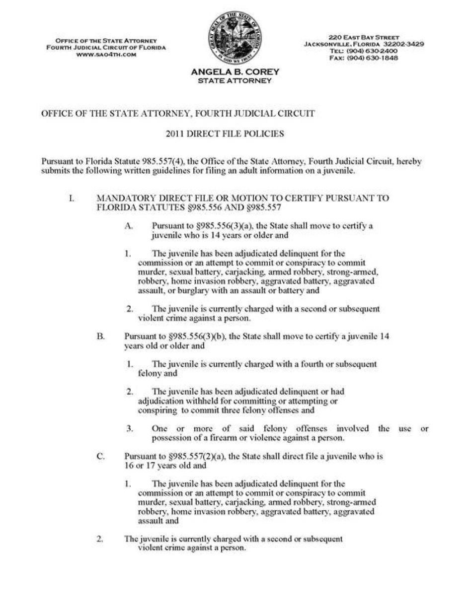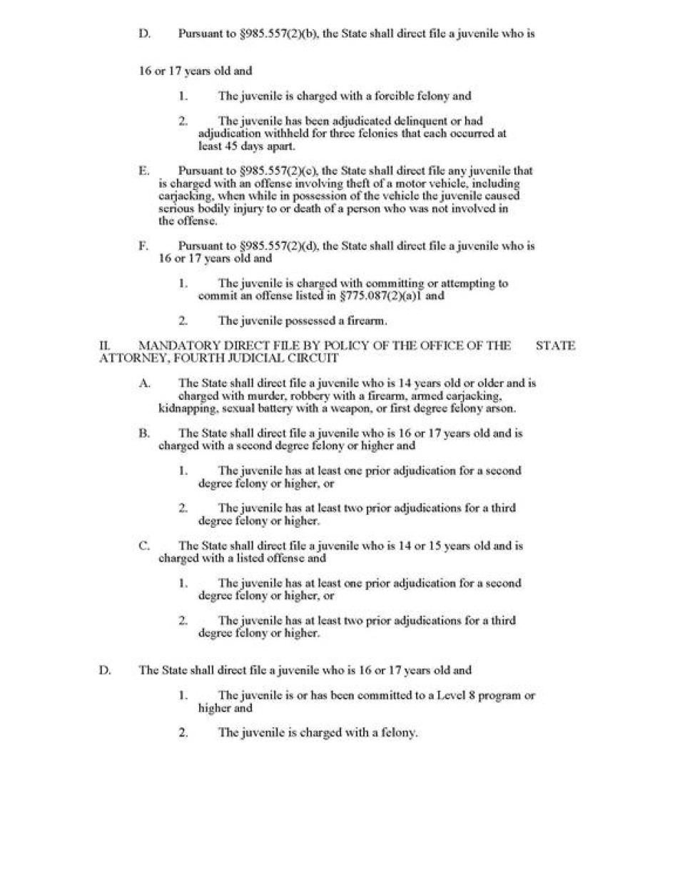 - Until direct file is eliminated, apply the discretion conferred on prosecutors by Florida law to stop the practice of direct file.