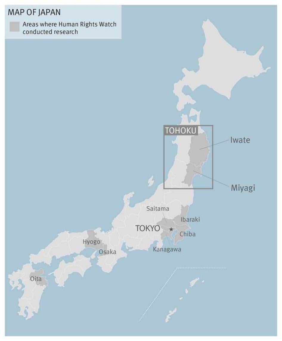 In Tohoku, in addition to the general situation of the alternative care, Human Rights Watch conducted research on children who lost their parents in the 2011 earthquake and tsunami. Kanto and Kansai were chosen since they have the largest population of children in alternative care in Japan and their systems have significant differences, seen by the continued operation of many large alternative child care institutions in Kansai. Human Rights Watch also conducted work in Oita because in recent years it had considerably increased foster parents placements.