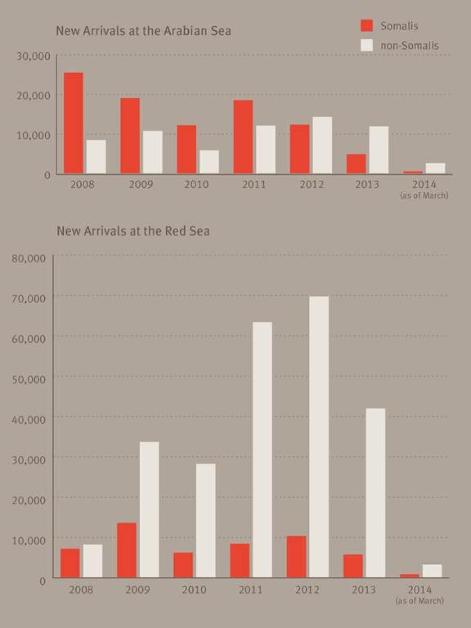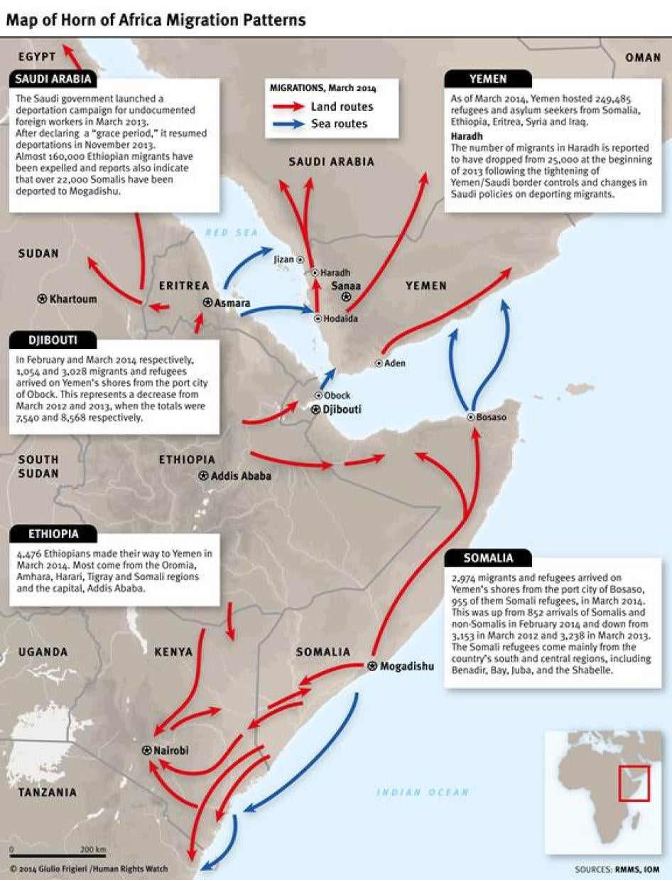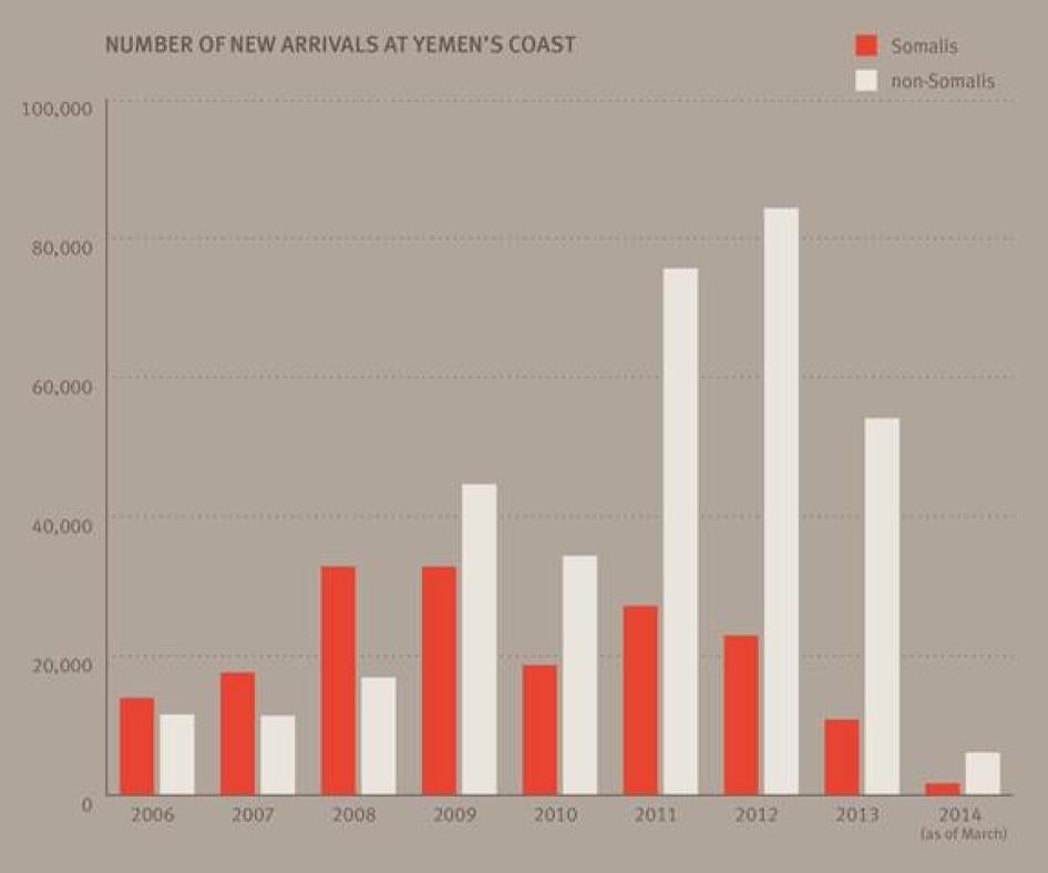 For decades, migrants from Africa have passed through Yemen to seek work in Saudi Arabia. Since 2010, more than 337,000 migrants and refugees have landed on Yemen’s coastline from the Red Sea and the Gulf of Aden. Their numbers rose significantly, and then dipped in July 2013, most likely due to a Saudi crackdown on undocumented migrant workers, only to rise again in March 2014. A multi-million-dollar trafficking and extortion racket has developed in Yemen based on the migrants’ passage. Its locus is the hot and dry northern Yemeni border town of Haradh, where one government official estimated that trafficking and smuggling make up about 80 percent of the economy.