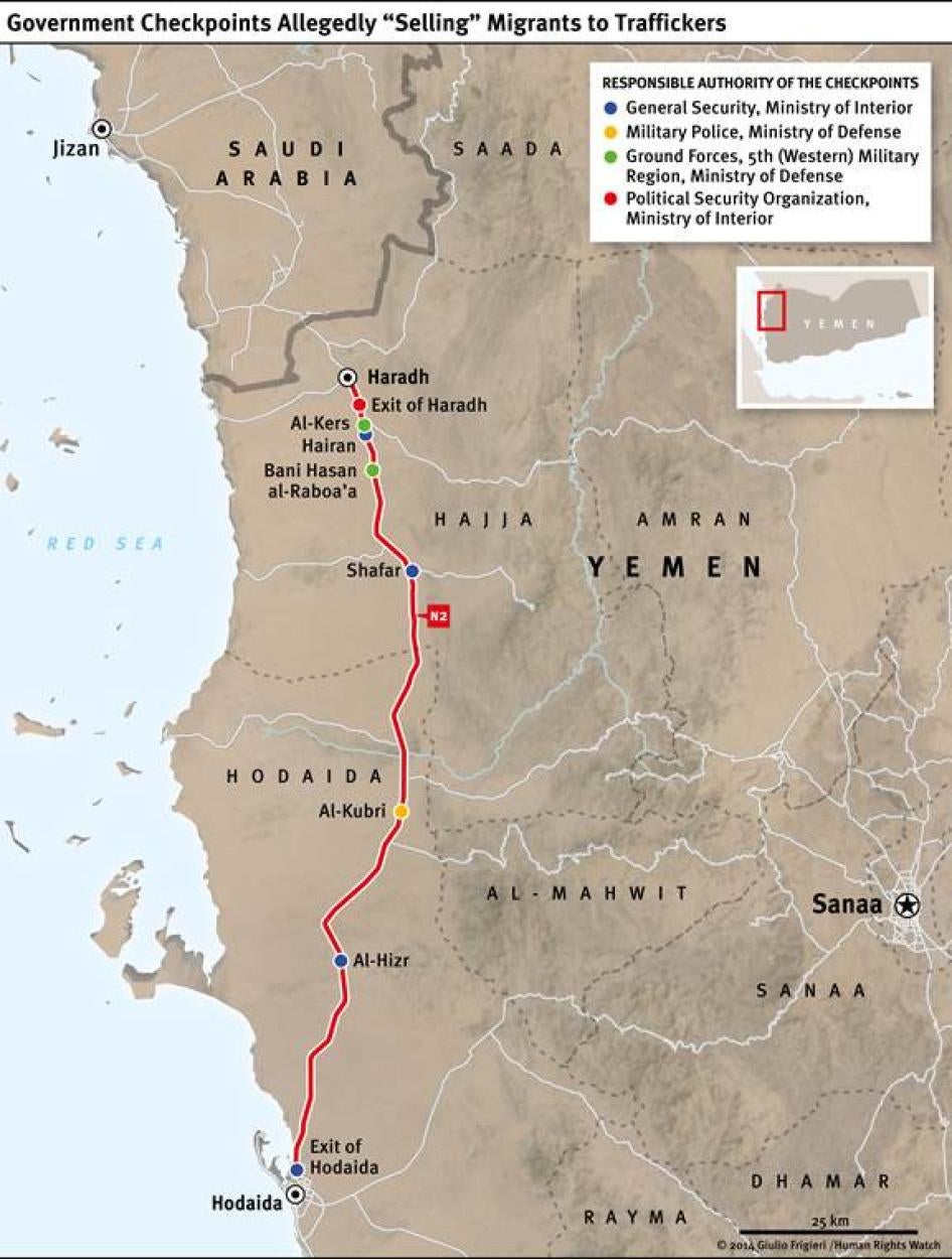 One migrant, Ali Kebede, told Human Rights Watch that he had escaped a torture camp with a friend in August 2013 and they walked for 10 days before Yemeni soldiers at a checkpoint near Haradh apprehended them. While the two were fed bread and tea, the soldiers made some calls and a car appeared with two men. The men discussed the hawala money transfer system with the soldiers, then handed the soldiers Saudi cash. The soldiers forced Kebede and his friend into the car, and the men drove them to their torture camp.