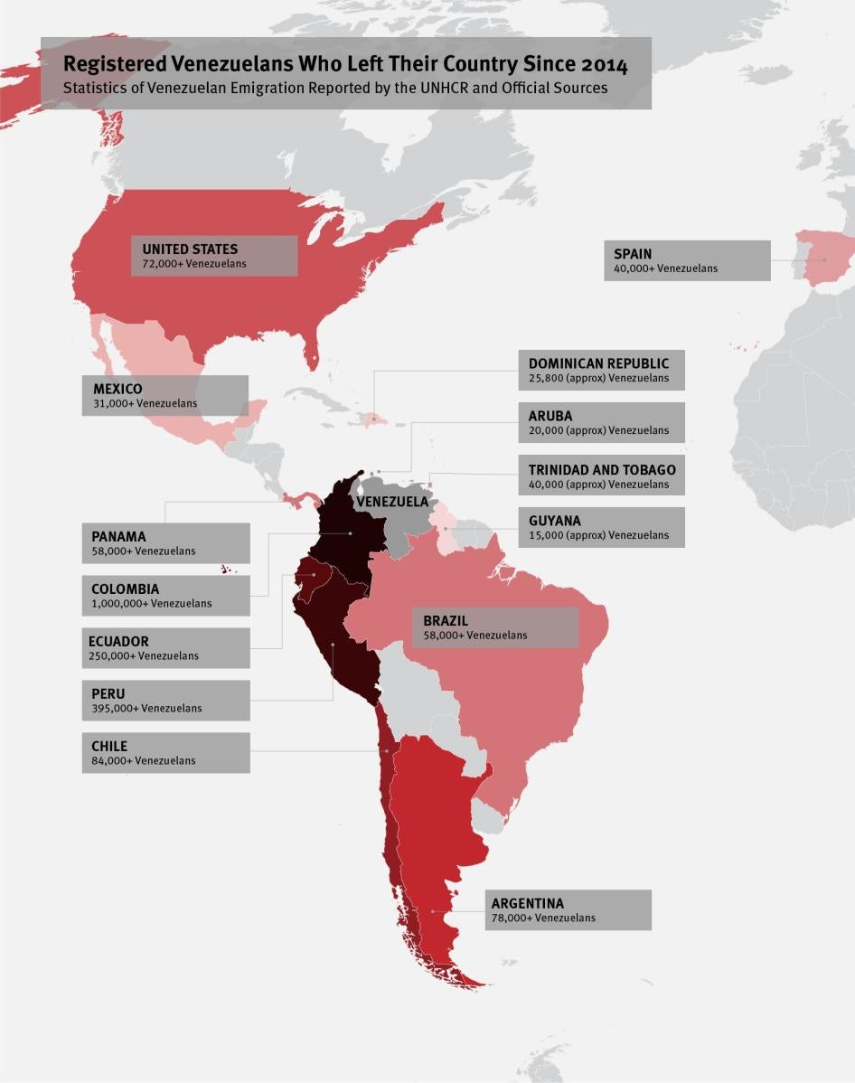 Venezuelans are fleeing their country for multiple reasons. Severe shortages of medicine, medical supplies, and food make it extremely difficult for many families to have access to the most basic health care and to feed their children. A ruthless government crackdown has led to thousands of arbitrary arrests, hundreds of prosecutions of civilians by military courts, and torture and other abuses against detainees. Arbitrary arrests and abuses by security forces, including by intelligence services, continue. Extremely high rates of violent crime and hyperinflation are also key factors in many people’s decision to leave the country.