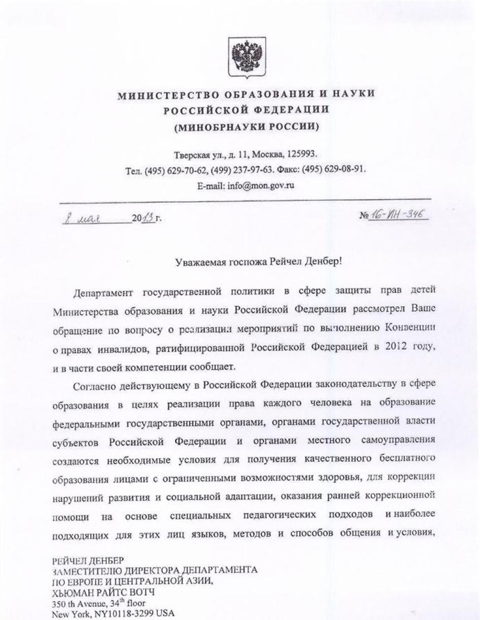 Хьюман Райтс Вотч направляла министерствам образования, культуры, здравоохранения, регионального развития, труда и социальной защиты, связи и транспорта письма с вопросами, изложением выводов доклада и предложением представить их видение ситуации, с тем, чтобы мы могли отразить его в докладе. Ответы были получены от Минкомсвязи (упоминается в тексте доклада), а также от Министерства образования и Министерства труда и социальной защиты. К сожалению, последние два поступили слишком близко к дате публикации, поэтому в самом докладе отражения не получили. Они приводятся в Приложении.