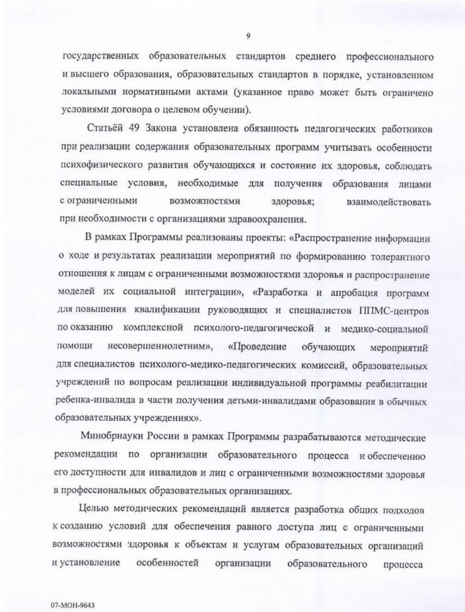- Разработать и обеспечить распространение информационных брошюр для людей с инвалидностью с изложением их прав по Конвенции о правах инвалидов и внутреннему законодательству России, а также с указанием названий и контактной информации правительственных и независимых инстанций, куда можно обращаться с жалобами на нарушение прав. Обеспечить наличие таких материалов в виде, доступном для людей с сенсорной и интеллектуальной инвалидностью, а также с отклонениями в развитии.