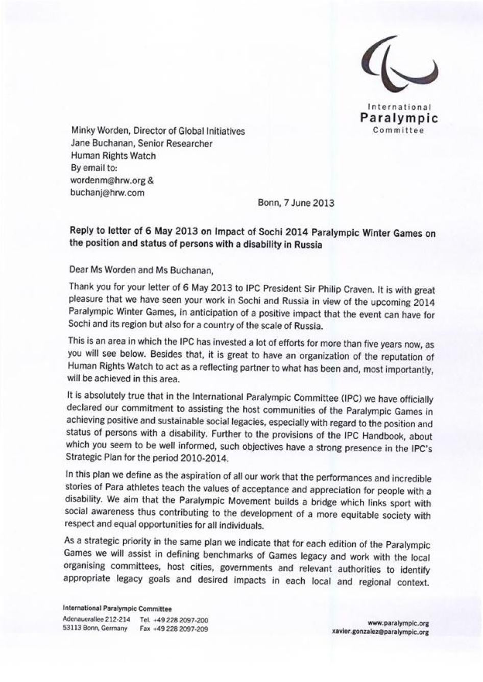 Хьюман Райтс Вотч также направляла Международному паралимпийскому комитету (МПК) письмо с нашими оценками доступности инфраструктуры и услуг в Олимпийском парке Сочи и в самом городе. Нас интересовали характер и степень приверженности МПК обеспечению того, чтобы подготовка Россией к Паралимпиаде соответствовала ее обязательствам в рамках Конвенции о правах инвалидов. Мы получили ответ, он отражен ниже.