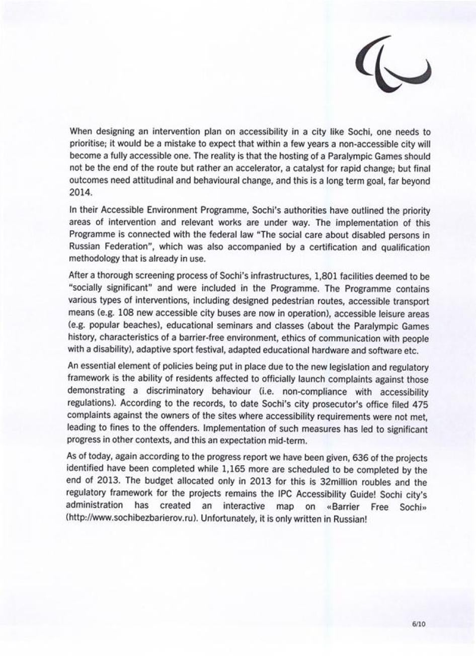 - В ходе инспекционных посещений Сочи и других принимающих городов проводить регулярные встречи с гражданскими организациями и независимыми активистами за права людей с инвалидностью для получения всестороннего представления о выполнении правительством требований МПК в области доступности, в том числе применительно как к организации самих игр, так и к принимающему городу, а также в отношении наследия Паралимпийских игр для принимающего сообщества. Активно учитывать независимую точку зрения при взаимодействии с властями принимающей страны по вопросам реализации требований доступности.