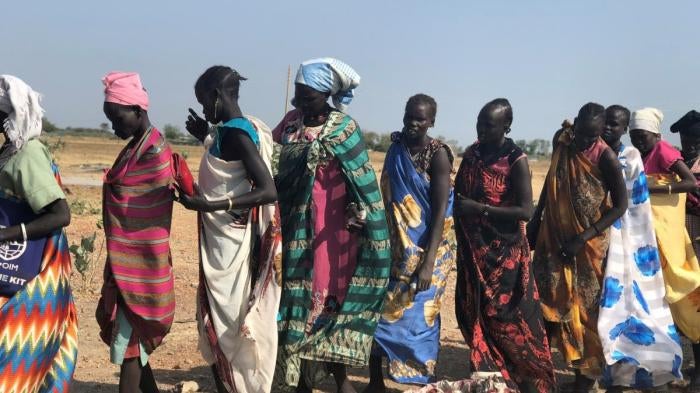 Women line up for food rations at a distribution site in Bentiu, South Sudan, on December 8, 2018.